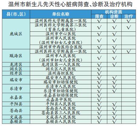 据了解,目前先天性心脏病治疗技术十分成熟,多数患儿可以通过介入微创手术治疗,和正常人一样,生长发育不受影响,因此大家不用谈“心”色变。此次核定筛查诊治机构,每个县(市、区)都有至少1家筛查机构,2家治疗机构分别是温州医科大学附属第一医院、温州医科大学附属第二医院(育英儿童医院)。