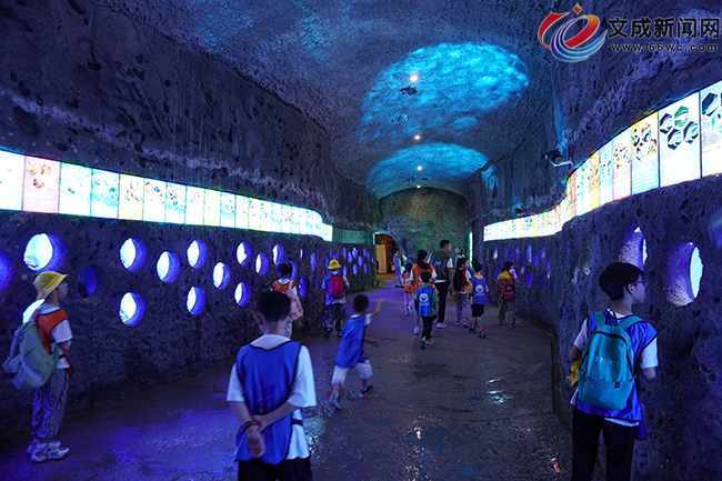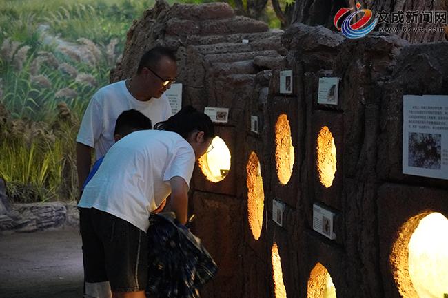 走进生物博览园,就仿佛进入了天然石窟之中,行进期间,不时还能看到石壁上展出的各类昆虫活体标本,只见研学团队的孩子们围在这些展示框前,认真地听领队老师的讲解,不时散开去观察研究不同的昆虫。