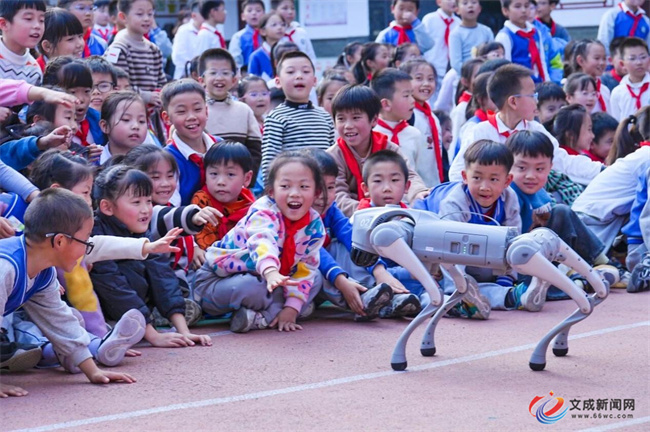 活动现场氛围热烈,智能互动环节率先点燃全场热情。智能机器狗迈着整齐步伐登台,灵活完成一系列动作;机器人“乐乐”主动与师生挥手互动,憨态可掬的模样瞬间拉近了与大家的距离;无人机在空中灵动穿梭,随现场欢呼声调整飞行轨迹,科技与活力的碰撞赢得全场持续掌声。
