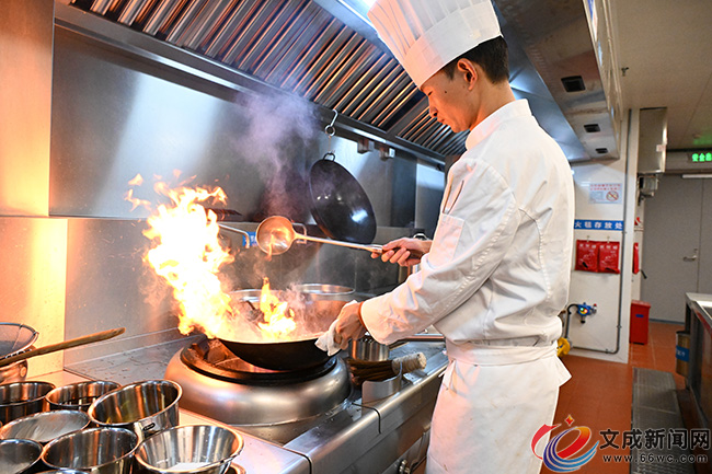 除了沉浸式的住宿体验,酒店的餐饮板块同样深耕伯温文化与本地特色食材。记者走进酒店后厨,只见桌上的文成粉丝、山珍、河鲜整齐码放,灶台上热气腾腾,酒店行政总厨雷景明正带领团队精心烹饪特色菜品。