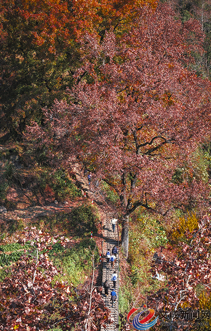 赛道上,竞技组选手们步履矫健、奋勇争先,在步道上展开速度与耐力的较量。欢乐组的参赛者则放缓节奏,或与家人结伴而行,或与好友并肩前进,在欣赏红枫美景的同时,享受着登山带来的轻松与惬意。