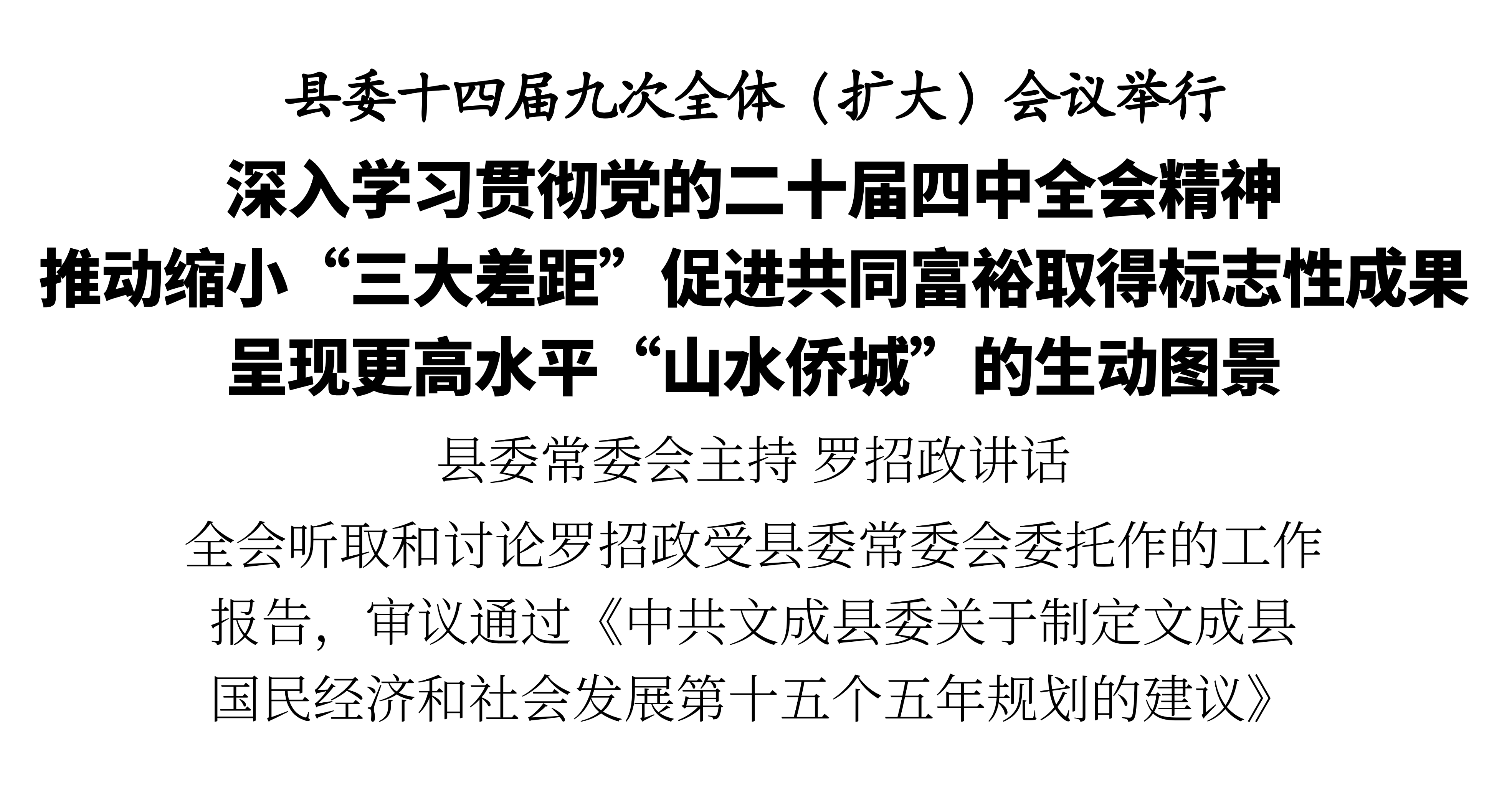全会深入学习贯彻党的二十届四中全会精神和习近平总书记考察浙江重要讲话精神,全面贯彻落实省委十五届八次全会和市委十三届九次全会部署,听取和讨论罗招政受县委常委会委托作的工作报告,审议通过《中共文成县委关于制定文成县国民经济和社会发展第十五个五年规划的建议》,进一步动员全县上下牢记习近平总书记殷殷嘱托,深入践行“八八战略”,锚定缩小“三大差距”主攻方向,扎实推进高质量发展建设共同富裕示范区县域实践,奋力谱写中国式现代化文成新篇章。会议结束时,罗招政就深入学习贯彻党的二十届四中全会和省委十五届八次全会、市委十三届九次全会精神,全面落实县委全会决策部署,做好当前和今后一个时期工作作了讲话。