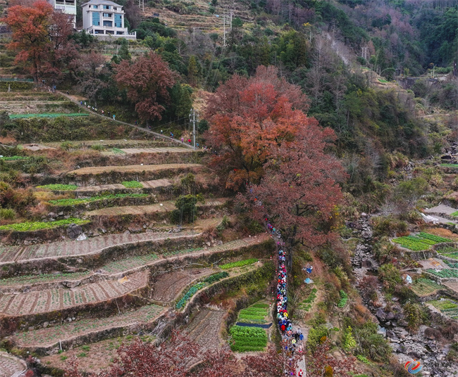 当日上午8时30分,随着发令枪响,选手们带着蓄势已久的兴奋,如潮水般涌出岩庵岭红枫古道起点。有人振臂高呼,有人快步疾冲,奔跑途中此起彼伏的笑声,让冬日的山野瞬间沸腾。选手们从广场启程后,沿红枫古道穿行林间,途经大峃镇、峡谷景廊等打卡点进行补给,最终抵达天湖景区终点。