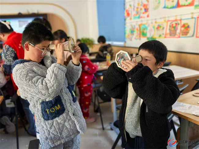 大坑村带领孩子们走进“筒中万象”的奇幻世界。通过组装万花筒、搭配彩珠亮片,方寸镜筒之中变幻出无限绚烂图案。指尖转动间,光影流转,创意迸发,孩子们在亲手创作中感知光学之美,发现了平凡生活中的魔法瞬间。