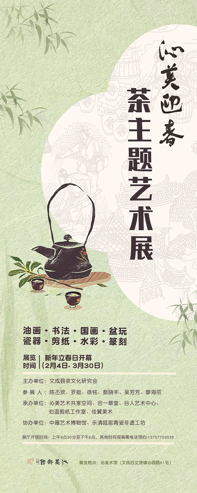 茶主题艺术展共分三层,展出的作品包含油画、书法、国画、盆玩、瓷器、剪纸、水彩以及篆刻,由陈丕欢、罗挺、徐铭、吴芳芳、蔡晓丰、廖海丽六位艺术家,各执妙笔,以独特创作语言,诠释茶文化的清寂、和静、隽永的悠悠意蕴。