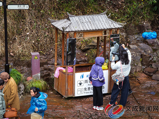在沉浸式体验江湖侠气的同时,景区全方位的服务保障更让游客倍感暖心。记者在景区内看到,各个关键路口都有黑豹救援队的身影,他们身着统一服装,为游客指引方向、解答疑问,时刻提醒安全注意事项。考虑到瀑布周边水汽较大,景区免费为游客发放雨衣,还在特定区域设置免费吹风机,贴心解决游客湿身困扰。“刚开始以为雨衣要花钱买,没想到是免费的,停车场还有保安指引车位,特别贴心。”苍南游客陈先生对这些细节服务赞不绝口。