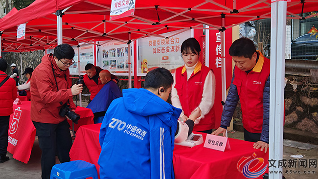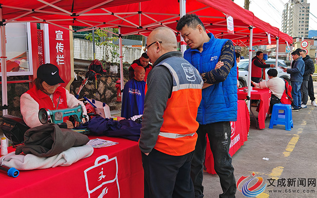 活动现场,六顶服务帐篷整齐排布,暖心汤圆、背包留影、背包缝补、背包义剪、背包义诊、安全电护六个服务区域同步开放,志愿者们分工明确、服务有序。一碗碗热气腾腾的汤圆送到快递员手中,甜糯暖意驱散了奔波疲惫;背包留影区前,大家有序登记;便民缝补摊位前,志愿者认真修补破损工装、调整不合身的裤脚;义剪区里,理发师细心修剪,让大家以清爽面貌上岗;健康义诊区变身“健康驿站”,为大家免费测量血压、提供健康咨询。