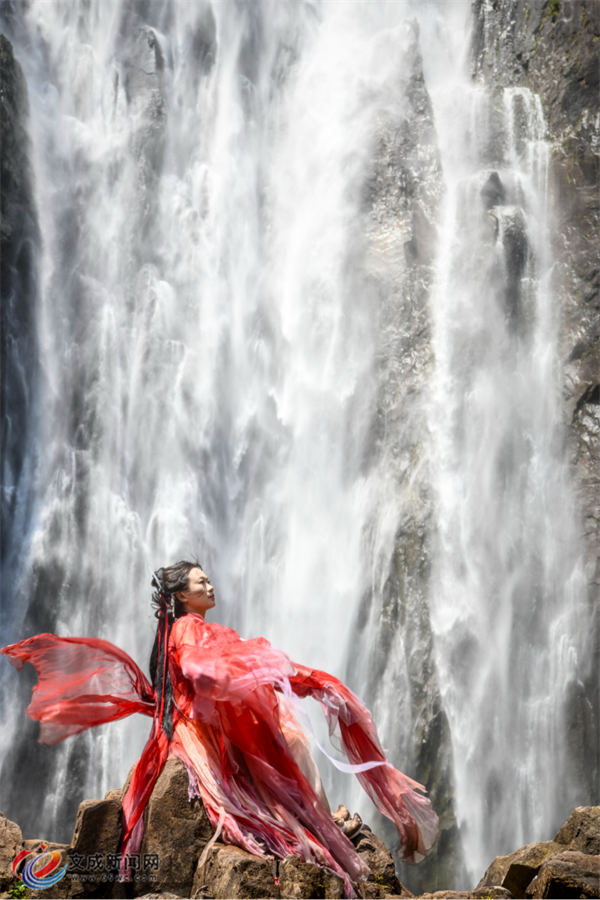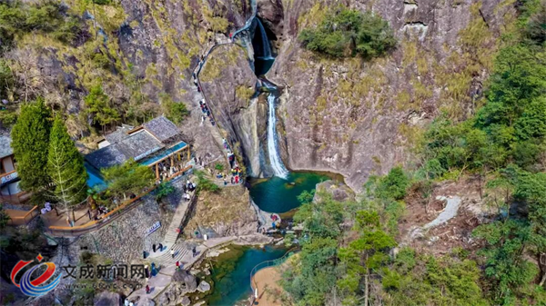 从天湖创意苗木园驱车片刻,便抵达“中华第一高瀑”百丈漈,是本次文成分会场的核心。峡谷雄奇、飞瀑流泉,自带一派雄浑洒脱的山水气韵;置身观瀑台,听瀑鸣轰鸣,赏水雾升腾缭绕,再结合武侠巡游、高空威亚等沉浸式体验,更能让人油然而生仗剑天涯、寄情山水的江湖情怀。